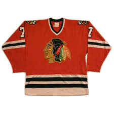 My first jersey was a nylon P.O.S. that I got at a Bar Mitzvah when I was 13 (I’m 35 now). It was red and basically a light mesh, penny-like material. Wore it to my first Blackhawks game, though. After that, I got a red and white replica jerseys (no name or number) and wore those to high school *every* Hawks game day. Home game? White. Away game? Red (yes, back in the day that’s what they wore – colors were away, white was home). Paired with with my Hawks’ hat that I wore 24-7. Needless to say, those jerseys got beat up real quick. Got lots of jerseys over the years… U of IL white, Anaheim Ducks white, Southeastern Connecticut Seahawks blue, Blackhawks white (with Chelios 7), Russian Republic Red (Khabibulin 35 – in Cyrillic!), Houston Aeros green (older jersey with the bomber), Chicago Wolves St. Patrick’s Day alternate green, USA Olympic (I believe 2002) authentic white and various Bauer, CCM and other such practice jerseys… Hell, I even MADE a few jerseys because I wanted to be in marketing and make that my career. I put my number (30 at the time) on the U of IL and Ducks and I put 41 on the Aeros. I want to get my name/number on the USA and the Wolves St. Patricks,..