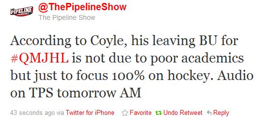So just to clarify, Charlie Coyle is leaving the NCAA for a CHL team in Saint John, not to sign a pro contract with Minnesota? Wow that is going to be one stacked Saint John team if he goes there with Galiev, Huberdeau, Jurco, Belieau etc