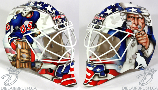 The mask allows goalies to show their individuality and when it comes to national teams, that individuality usually manifests itself in some incredibly patriotic designs. There have been many great masks in tribute to our troops, others that pay homage to some of our great monuments and symbols and even a few that incorporate U.S. hockey history into them.