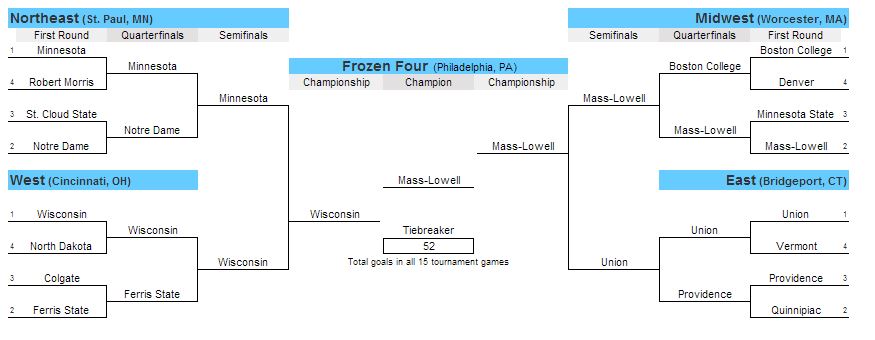 As for the rest of the Frozen Four, I like Union’s offense to carry them through to Philadelphia, Minnesota’s depth to be a little too much for other teams in the west and Wisconsin continuing their hot streak all the way to the final game. How fun would a Minnesota-Wisconsin semi be?